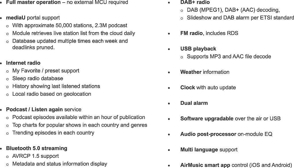 The module is suitable for a range of audio applications including table top radios, clock radios, micro-systems, portables, and wireless speakers.