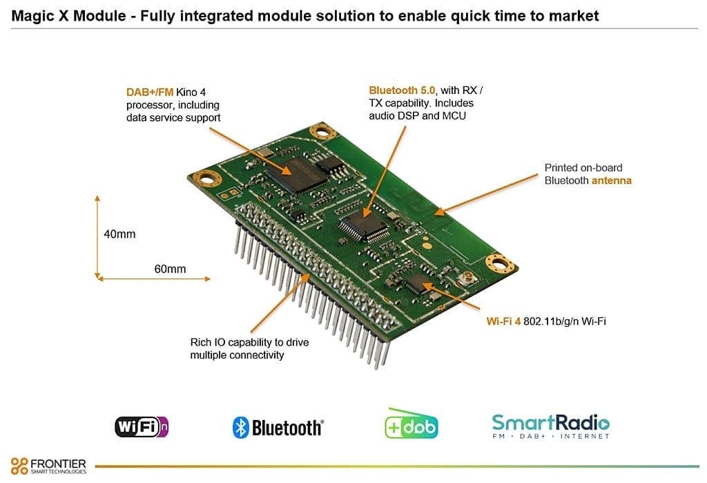 Frontier today launches FS2260 Magic X, a next generation SmartRadio (sometimes called hybrid radio) module combining state of the art module design, Wi-Fi and Bluetooth connectivity, with market-leading Frontier DAB/DAB+ technology offering a comprehensive user-listening experience.